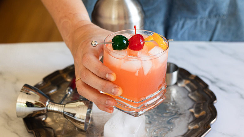 - Garnish the cocktail with the orange twist and two-toned maraschino cherries, then serve.