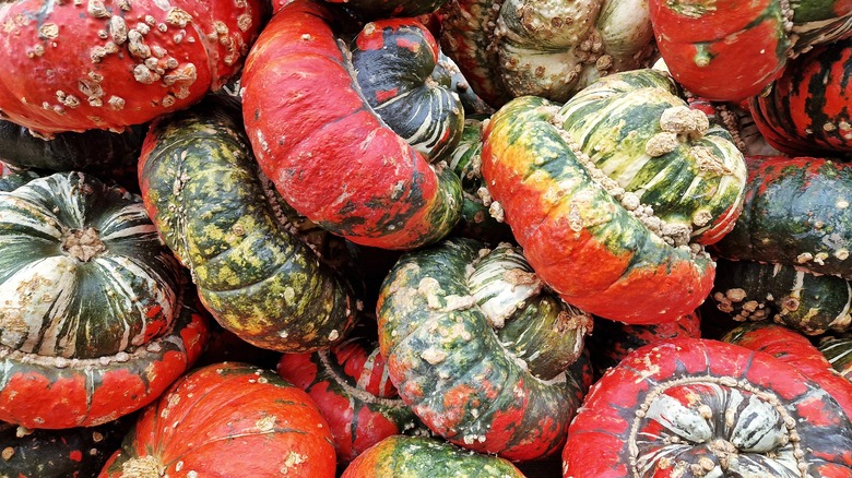 Turban squash varieties include the American turban, Mexican hat, and Turk's turban, per Specialty Produce, but all share the turban shape, brilliant coloring (including red, orange, yellow, green, and white), and stripey markings. They also all share a dense and starchy flesh that's mild, sweet, and slightly nutty in flavor, like many other winter squashes, including butternut and acorn. In addition, all are considered "heirlooms," which Burpee explains means that they've been naturally pollinated over a period of at least 50 years. Of course, turban squash goes back much further than that, with its first written reference dating back to 1818 (in a French encyclopedia), according to Specialty Produce. And since squash has existed in various forms since at least 8,000 years ago, according to the University of Illinois Urbana-Champaign Extension, it could go back considerably further than the early 19th century – albeit perhaps not as an edible squash.