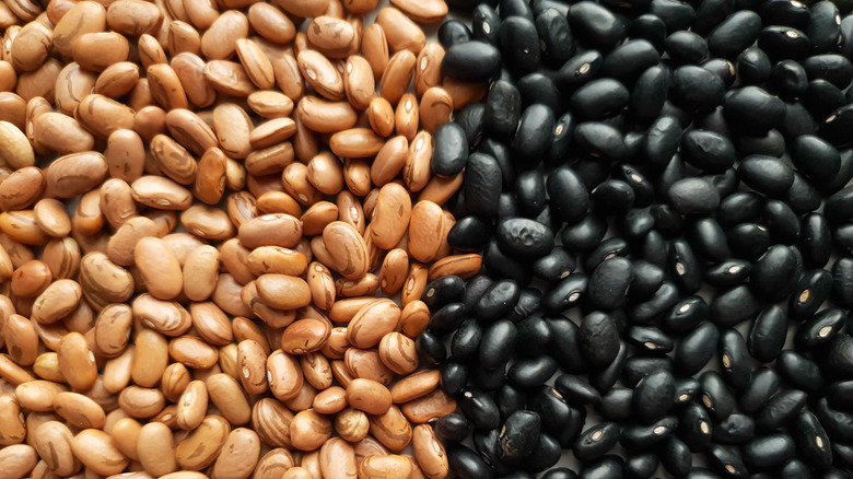Well, according to Diffen, both black and pinto beans are actually great sources of protein and fiber, and their raw calorie count is not too far apart either. Pinto beans, in particular, are packed full of different nutrients like thiamine, iron, magnesium, potassium, and phosphorus, per Healthline, and they're quite easy to add to any meal. For canned pinto beans, however, the nutrition can vary quite a bit with all of the preservatives and additives like sugar and salt.