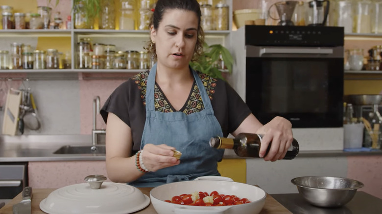 Ottolenghi: We can highlight some from the book that are really cool and different and special. We have za'atar tomatoes, which are cherry tomatoes that are confited in olive oil with some balsamic vinegar. Once they've gone through this process, they have za'atar added to them and some fresh herbs. That becomes something that can sit in a jar and jazz up meals.
