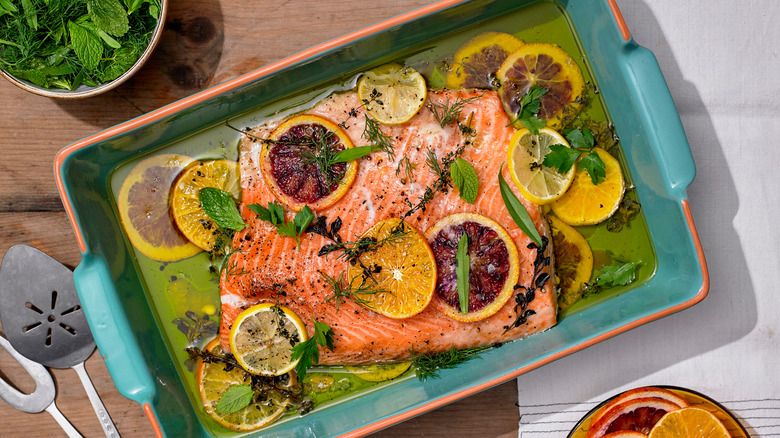 When it comes to salmon fundamentals, remember to be liberal with your application of fat — both for flavor and preventing the fillet from sticking. To get the best of both worlds (i.e. crispy skin and melt-in-the-mouth flesh), sear your fillet skin side down on high heat until brown before transferring to a 200-degree Fahrenheit oven for around 40 minutes (via The Endless Meal). And, if you really care, leave the fillet uncovered.