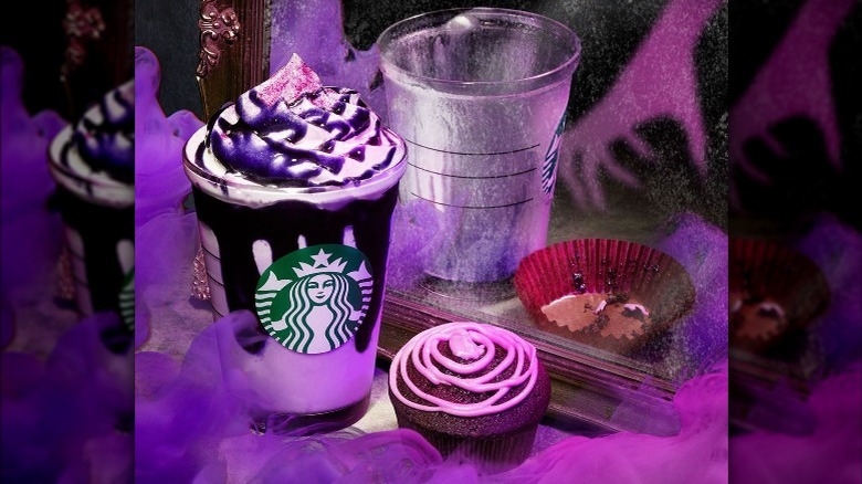 Starbucks Japan has released a spooky, sweet new treat on its menu for Halloween. The Purple Halloween Frappuccino lives up to its name with its vibrant purple appearance and is available now at Starbucks' Japan locations. The frappuccino blends a purple sweet potato powder with milk and adds a vanilla sauce also made from purple sweet potatoes for a lightly sweet flavored drink (via Starbucks Japan). For a sugary finish, the drink is topped off with whipped cream.