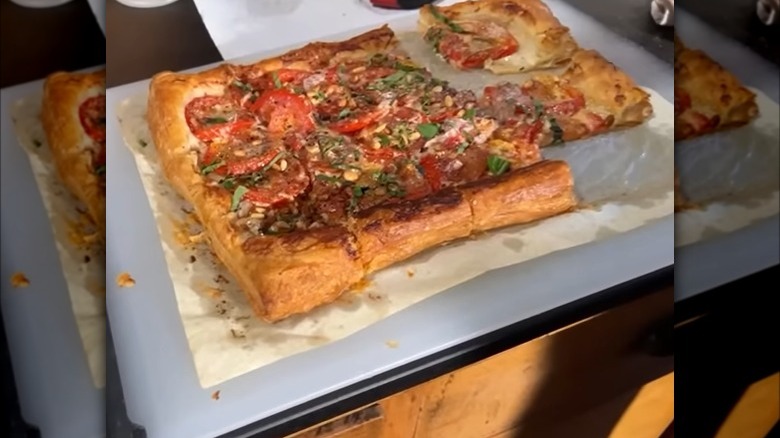 You might assume that a dish that warranted such a bold response would have to be made entirely from scratch, but Brown's tomato tart actually involves an important store-bought ingredient — frozen puff pastry dough. Once he rolls it out, he pricks it with a fork all over, then layers on crème fraîche, grated gruyere cheese, thyme, roasted tomatoes, more gruyere, sliced garlic, chopped shallot, black pepper, and more gruyere. The tart goes in the oven and gets brushed with butter and topped with pine nuts partway through. Once it's done cooking, basil and Aleppo pepper are the finishing touches, and it's ready to enjoy.