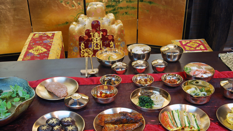 That sort of luxury only increased around special occasions. Per Visit Korea, holidays like Chuseok (Korean Thanksgiving) or Dongji (winter solstice) spawned banquets with full-fledged feasts. Months of preparation went into setting up tables with decorative tteok (rice cake) and hangwa (sweet confections) for certain celebrations, yet, those foods were mostly for show. On his birthday, the king ate entrees like noodles or dumplings alongside side dishes like green-lentil jelly, pancakes, and sashimi (via Science Direct). Seasonings included honey, mustard, and red pepper paste. Fruits like lychee, nectarines, pomegranates, and drinks like hawthorn berry persimmon punch provided a refreshing element. Rice cakes and other sweet treats were abundant. Indeed, the Joseon Dynasty took "eating like royalty" to a different level.