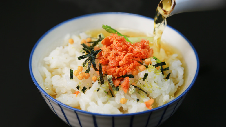 Ochazuke is often prepared in two main ways: with tea or with dashi. The original version of ochazuke used green tea, and it was invented during the Heian period of Imperial Japan (via Recipe Tin Eats). It was a method of utilizing leftover cold rice by adding hot tea to rejuvenate it. Thanks to the accessibility of its ingredients, along with its easy preparation, ochazuke became a staple for the Japanese.
