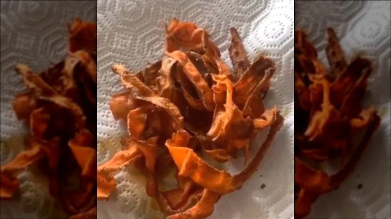 There's no denying that good bacon, vegan or otherwise, has got to be crispy. What's the quickest and easiest way to achieve that texture with carrot bacon? "The air fryer makes it crispy," said Brown. Of course, crispy carrots are not going to give you that indulgent and craveable essence of bacon alone. Brown also says you need a "little bit of maple syrup" as well as "that little bit of liquid smoke" to truly bring out those bacon flavors we know and love.