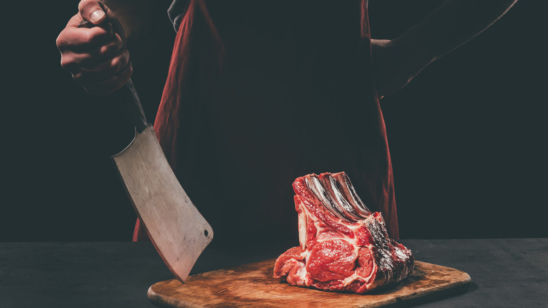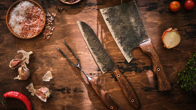 Then there is the much larger, heavier, but no less versatile butcher's knife or meat cleaver. Alliance Online says that butcher's knives can come in a variety of sizes depending on their usage, but always feature a wide, rectangular blade that usually has a hole in the corner so it can be hung instead of fit inside a knife block. Chef Sac points out that one of the biggest benefits of the butcher's knife is its weight. This heavier blade allows you to put more energy behind a cut when needed, and its high handle also allows you to chop without worrying about hitting your hand on the cutting board.