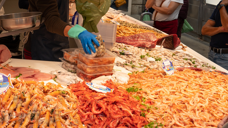 What's the difference between shrimp and prawns that taste good versus those that taste great? How you prepare them certainly plays a part, but choosing fresh shellfish is crucial to achieving the most delicious results. Whether you're looking to serve a sumptuous shrimp cocktail or your favorite chilli prawns recipe, you'll need to know what to shop for when searching for the main ingredient. You might think the plump, chilled, shrimp displayed in your grocer's seafood case is top-tier by looks alone. Yet, most prawns and shrimp are frozen until they reach their final destination at your local supermarket — so if you're looking for the freshest catch, opt for the shellfish stored in the freezer section.