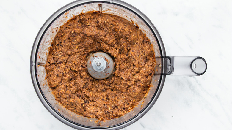 Once you have your ingredients measured and chopped and prepped, it's time to get to the food processing of it all. First, add the onion and garlic to a food processor (a high-speed blender works too) and blitz them a few times to break the pieces down small. Then add all of the remaining ingredients — except for the olive oil, which is for frying — to the food processor and run it until they have combined well. (You may need to scrape some ingredients down the sides of the device and then keep running it.)