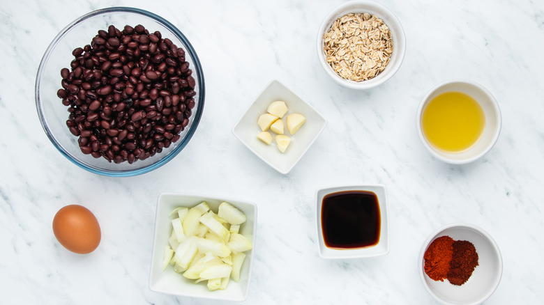 To make a flight of these hefty, tasty bean burgers, you'll need a couple of cans of black beans, some roughly chopped onion, some roughly chopped cloves of garlic, rolled oats, an egg, soy sauce, chili powder mix, smoked paprika, salt and pepper to taste, and olive oil for frying.