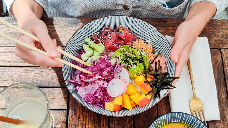 There are a few different ways to enjoy poke bowls. According to USS Nemo, poke should be enjoyed without being mixed. It claims that it's best to take small bites of each ingredient and topping, experimenting to see which flavors go best together. That's also one of the reasons why poke is best enjoyed with chopsticks, which make careful selections of each item look easy.