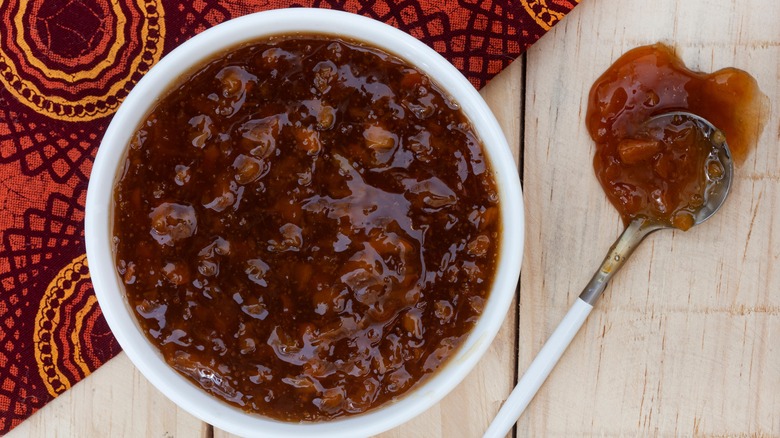 Lakshmi chose these chutneys to pair with Boursin; she's Maison Boursin's Host in Residence throughout 2022. Take or leave the cheese. Definitely accept her chutney wisdom. "A great chutney that I would pair with Boursin is if you like spicy food, I make a chutney with dried Angelino plums, which are red. They're not prunes," Lakshmi specified to Tasting Table. "I mix that with a couple of chipotle peppers in adobo and grind it, and you put a little olive oil to make it mix. That's hot and sweet. If you add a little lemon juice to it, it's also tart. Those are my favorite things to have together."