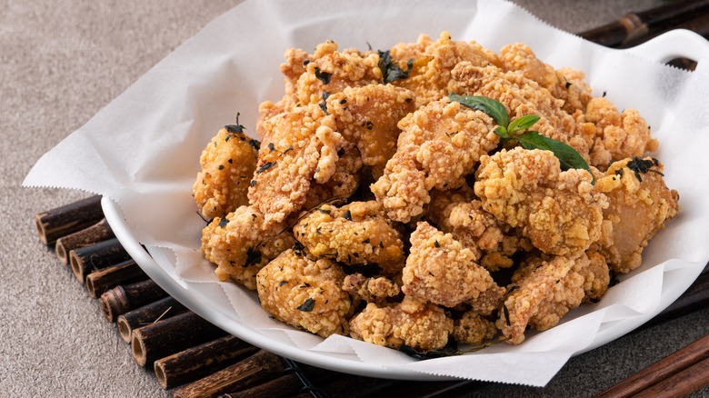 One of these special helpings lies in the form of Taiwanese popcorn chicken, a popular item within the street food market. Upon first glance, one may notice a few aesthetic differences between regular ol' popcorn chicken and the Taiwanese stuff. First, the addition of Thai basil leaves adds elements of licorice, spice, and vibrant colors to the latter's batch of chicken (Thai basil can also handle high heat very well), as noted by MasterClass. Second, Taiwanese popcorn chicken is typically coated with some kind of seasoning mix, which may highlight the likes of hot paprika, salt, and ground peppercorns, via Wok and Kin.