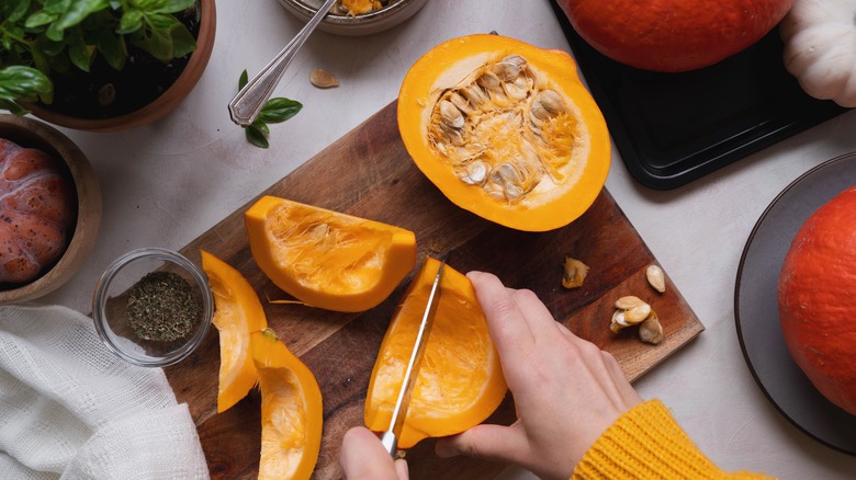 Fall is the perfect time to start incorporating pumpkin into your diet, per Food Network. Whether you are picking these lovely pumpkins fresh at a pumpkin patch or buying one in your grocery stores during the autumnal months, pumpkin can really add some flavor, texture, and depth to your recipes. That's right: Pumpkins are for more than carving up for Halloween night and decorating a front porch. This round-shaped squash that inspires visions of Cinderella's carriage is also a powerhouse of nutrition. Food Network goes on to reveal that a single cup of cooked pumpkin has no fat and adds just 50 calories to your daily calorie count. The flesh of the pumpkin is chock full of antioxidants, and if you are a fan of noshing on those seeds, you can get a little protein and omega-3 fats.