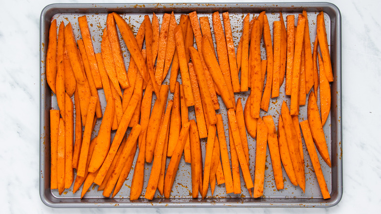 - Place the sweet potato strips on a large baking sheet. Using your hands, toss them with the olive oil, garlic powder, smoked paprika, and chili powder.