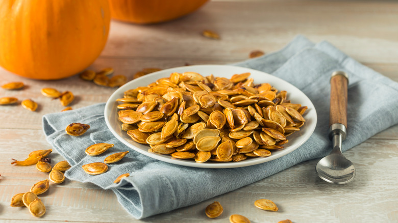 Despite how the orange, seed-entangled entrails of your pumpkin may look on a plate, preparing raw pumpkin seeds for roasting is actually relatively simple. After all, you can make the cleaning process easy by allowing the seeds to soak in a bowl of water. But once you've properly de-gunked your soon-to-be snack, drying them off with a rag is not the final step in the pumpkin seed preparation process.