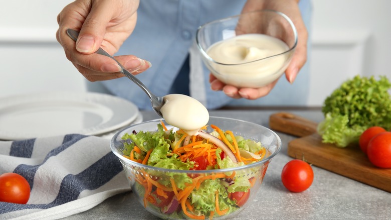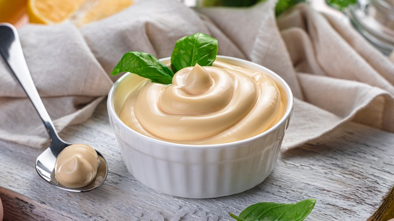 According to How Stuff Works, mayonnaise is an emulsion of egg yolks, oil, acid (typically lemon juice or type of vinegar, per Masterclass), and seasonings. Emulsions take two substances that usually don't mix and beat them together, suspending the separation. When making mayonnaise, you must constantly beat the egg yolks and acid while slowly pouring in a stream of oil until you get a nice creamy sauce.