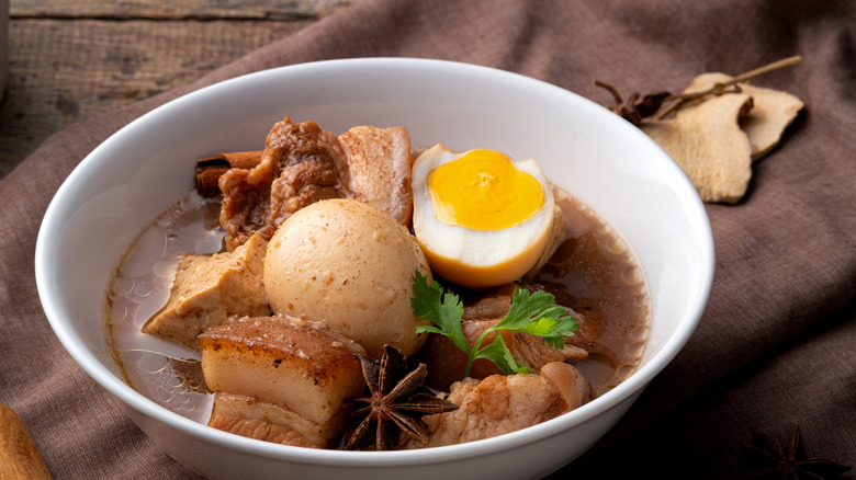 The base of this dish is its flavorful braising mixture. Thai Cookbook TV says this usually consists of coriander, garlic, star anise, cinnamon, black pepper, and Sichuan pepper. According to Hot Thai Kitchen, these spices are combined with palm sugar to create a sweet and spicy broth that nicely complements the rich flavors of the meat. It's worth noting that this dish omits many of Thai cuisine's most common spices like galangal, makrut lime, Thai basil or tamarind, so if you're craving those quintessential flavors, you would be better off with something like tom yam pla.