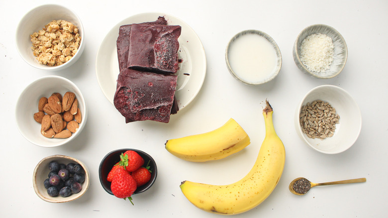 If you've made an acai bowl before, then you likely know most of the ingredients that go into it. All you need is frozen acai berries, bananas, coconut milk (or any other non-dairy milk), granola, strawberries, blueberries, almonds, chia seeds, shredded coconut, and sunflower seeds.