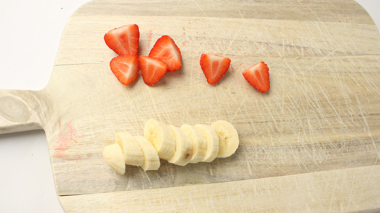 Grab a cutting board and sharp knife and add the remaining half banana and the strawberries. Slice them well and set fruit to the side until you need them again.