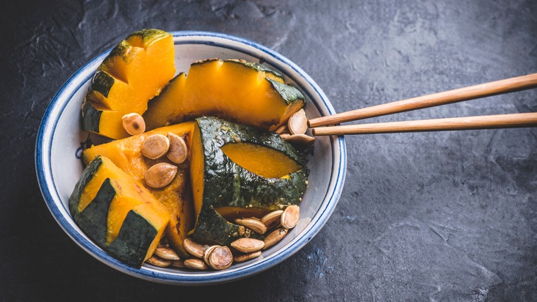 The simplest way to prepare kabocha is to steam it in the microwave as you would a quick baked potato. You can section the kabocha and deseed, then place it into a microwave-safe bowl and cook for a few minutes. When dry-heated, the kabocha becomes sweeter as the natural sugars caramelize (via WebMD). At this point, the skin can be peeled off or you can eat it for some extra fiber and nutrients. Kabocha is sweet and tender on its own and doesn't need any butter or syrup to enhance its flavor.