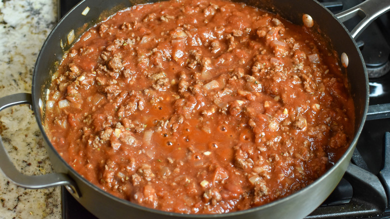 - Add the garlic and cook for 1 minute, stirring, then add the crushed tomatoes and dried basil and stir to combine with the beef and onions, cooking until bubbly.