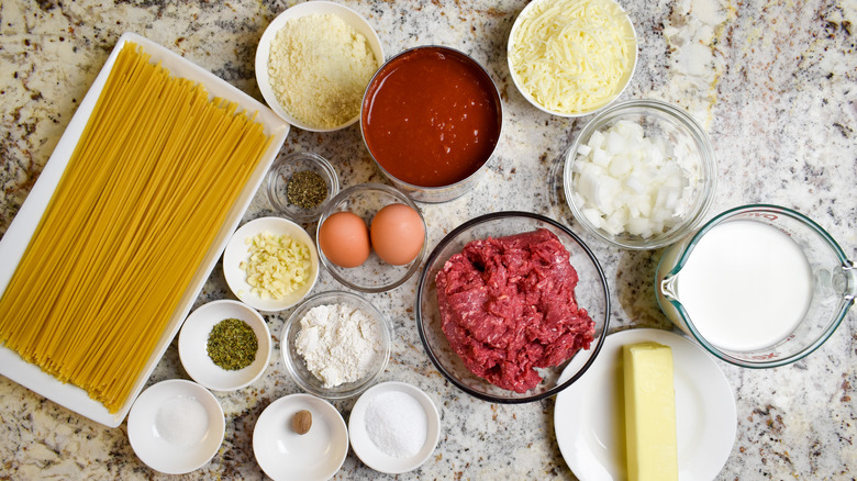 To make this delightful meal in a pan, you'll need spaghetti, chopped yellow onion, ground beef, kosher salt, minced garlic, canned crushed tomatoes, sugar, dried basil, butter, eggs, Parmesan cheese, flour, whole milk, fresh ground black pepper, fresh nutmeg, mozzarella cheese, and a good non-stick cooking spray. And you'll need solid 2 hours from start to finish when you factor in all the boiling, baking, and cooling, so plan ahead!