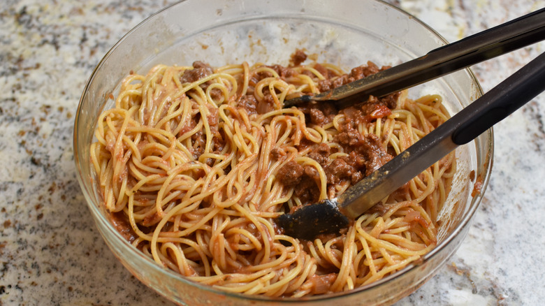 - Add the beef/tomato sauce to the spaghetti and toss to coat.