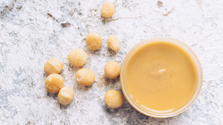 Macadamia nuts contain different minerals and vitamins, including manganese, thiamine, copper, magnesium, iron, and vitamin B6 (via Healthline). They are also fairly high in calories, with 28 grams of macadamia nuts containing 204 calories. In addition, that amount will have 23 grams of fat. The fat in macadamia nuts includes monounsaturated fats, which can help to lower total and LDL cholesterol levels, per Healthline.
