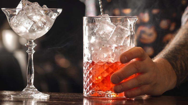 But preferring the classics doesn't mean there isn't room for variation. Something as simple as swapping gin for vodka in the martini creates the now timeless vodka martini. And while too many argue over shaking or stirring the aforementioned drink, there are also those who believe that adding ice to a rock glass and serving your martini or your Manhattan on the rocks is blasphemy — it just isn't so. While cocktail artisans might wince when you order it, adding ice to your Manhattan takes it from the hallowed mahogany halls of the elite's private clubs and hands it straight to the common man. In fact, serving these legendary cocktails over ice has a history almost as classic as the drinks themselves.