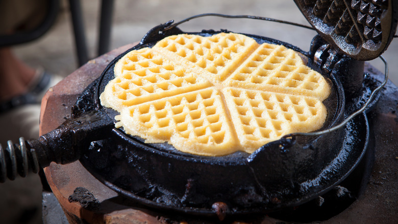 The Crusades triggered one of the most important developments in waffle history. Per Mental Floss, when Crusaders returned to Europe, they brought spices such as cinnamon and ginger. Cooks began spicing up their oublie batter, and it should come as no surprise that these overtook the traditional, bland wafer. Eventually, people started adding leavening agents to the batter, which required them to make the cooking irons deeper. With this development, waffles went from a thin cracker-like food to the fluffy delights we now enjoy. However, there were some serious issues with the original handheld waffle irons. Smithsonian Magazine notes that they were extremely heavy and awkward to handle. They made it hard to check on the waffle as it cooked, and people often burnt theirs. More importantly, the cook had to hold the iron over an open fire, and many people scorched their hands.