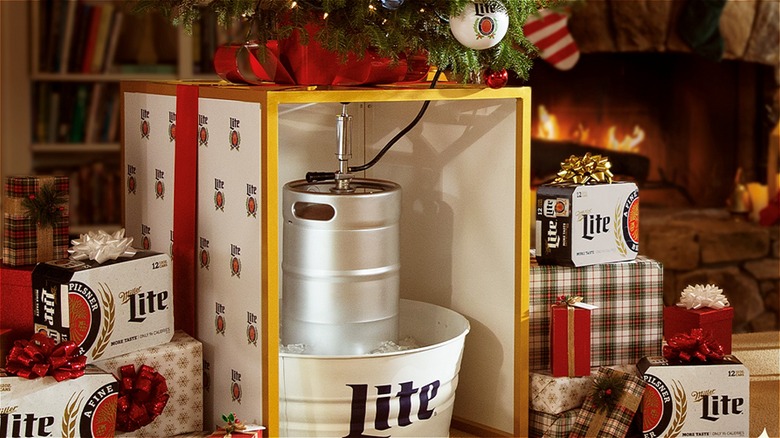 Miller Light's Christmas Tree Keg Stand is effectively just a small table with a weight capacity of 150 pounds (that works out to roughly a 5-foot Christmas tree with decorations, per CNN). The kicker, though, is that this table also stands tall enough that a quarter-barrel keg can easily fit beneath it. Via USA Today, that's 83 12-ounce cans. (Talk about a jolly holiday.) The top of the stand is outfitted with openings for the keg tap, the picnic faucet, and the beer line, a setup meant to give the illusion that beer is being tapped straight from the Christmas tree itself. In the spirit of the season, the stand is wrapped like a present in festive paper bearing the Miller Lite logo and a massive red ribbon, per People. The decor is functional, too: the bow on top can hold water for live Christmas trees.