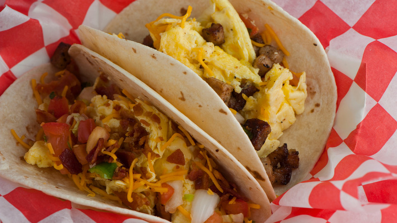 It's no secret that people can't get enough of tacos. As of 2019, U.S. consumers put away an average of over 4.5 billion tacos every single year. October 4 is National Taco Day, and folks have been observing "Taco Tuesdays" since the '80s. And while Ina Garten loves breakfast for dinner, other foodies love dinner for breakfast. That's right — we're talking about the breakfast taco. According to Serious Eats, breakfast tacos typically come in a flour tortilla, less often than corn. In Texas' Rio Grande Valley, breakfast tacos are customarily filled with scrambled eggs and meat like chorizo, bacon, "machacado" salt beef, or sliced hot dogs. These Tex-Mex-style Migas Breakfast Tacos include lime, diced tomatoes, and green chiles.