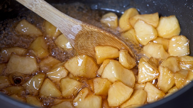 The best kinds of apples for compote are also some of the varieties we love to eat straight off the tree. MasterClass recommends varieties like Granny Smith, Braeburn, Fuji, Honeycrisp, Macintosh, and Pink Lady, as they have the ideal crisp texture that won't soften too much when you cook them. Apple varieties that tend to disintegrate when simmered include the Golden Delicious and the Red Delicious, which Eat This, Not That considers the absolute worst apple for cooking. One of the virtues of apple compote is that you can adjust the sweetness to your liking, adding a bit more sugar if the variety of apples you're using is a bit too tart.