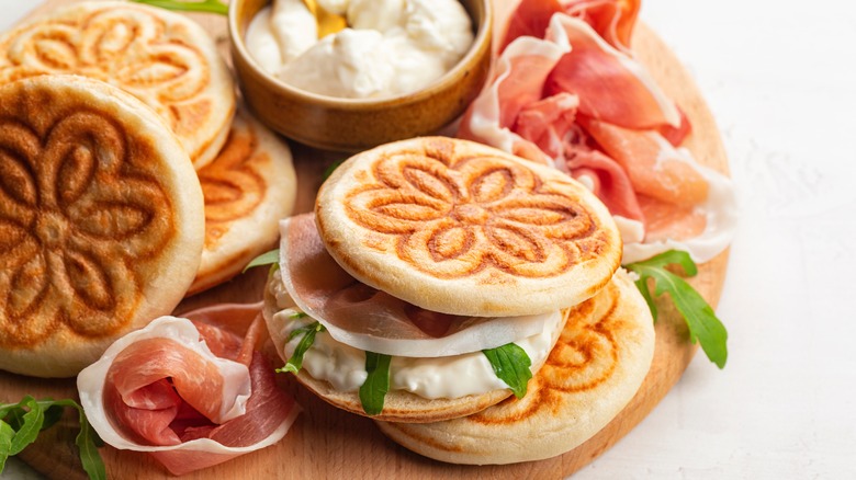 Tigelle has proven to be versatile and can be made for dessert, as well, with fillings of chocolate hazelnut spread, mascarpone cream, or blueberry marmalade, per Philosokitchen. Great Italian Chefs' recipe sticks to the savory fillings and recommends meats such as salami and cheeses of a person's choosing. Sanpellegrino says you can't go wrong with stuffing tigelle with any cured meats or sausages, such as mortadella, salami, or ham.