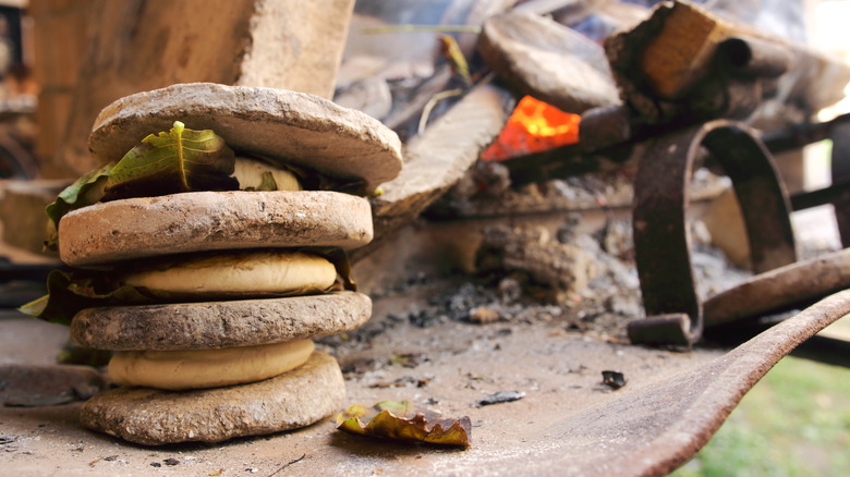 To appreciate a tigelle sandwich, first, you need to understand the bread. It originated in the Apennine Mountains, near Modena, Italy, according to National Geographic, at a time when farming families would bake the evening bread together over a fire. These families would bake balls of dough called crescentine in clay molds that were known as tigelle (per Art Viva). The tigelle molds would be hot when the dough was placed in them, and then they would be stacked on top of one another, which would make baking the bread even faster, according to National Geographic. After removing the bread from the molds, it would be divided and covered with a topping similar to pesto and cheese.