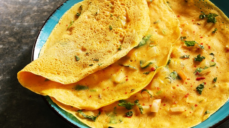 But if you're going the savory route, you'll need to chop up some vegetables — onions and tomatoes are typically used. Spinach, grated carrots, beets, and zucchini are also recommended, along with fresh herbs like fenugreek and cilantro. Once chopped, put them in a bowl along with some seasonings (carom is important for aroma and turmeric for color), your chosen flour, and water, and then mix until smooth. Then, pour the mixture onto the griddle and flip when the sides start to pull back from the pan.
