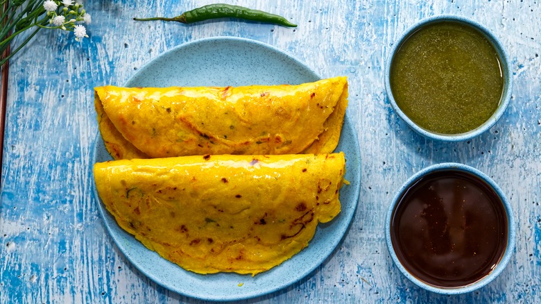 However, besan chilla can certainly be dressed up — food blogger Chehati, for example, stuffs theirs with paneer, a soft, unaged Indian cheese that doesn't melt. They also top it with bright green cilantro chutney and ketchup, which is possibly a shortcut ingredient for the tomato chutney or sauce that Food Trails 25 claims it's commonly eaten with. If you're keeping it vegan, on the other hand, Some Indian Girl recommends substituting the paneer with tofu. It's the alternative they grew up using the most and comes with a boost of protein.