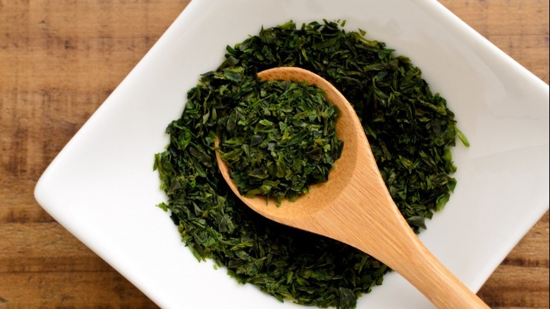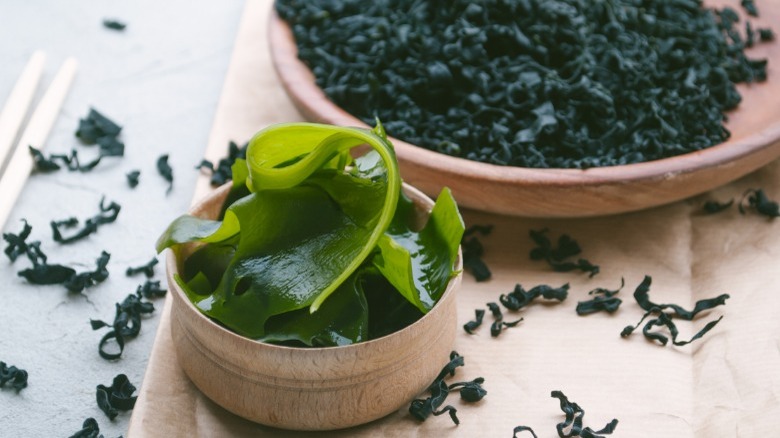 Wakame is a type of kelp that is native to Japan, Korea, and China, but shows up in various parts of the world as one of the worst invasive species (via the National Park Service). Despite its reputation as an aggressive ocean invader, it has a mild, faintly sweet flavor and a soft, silky texture.