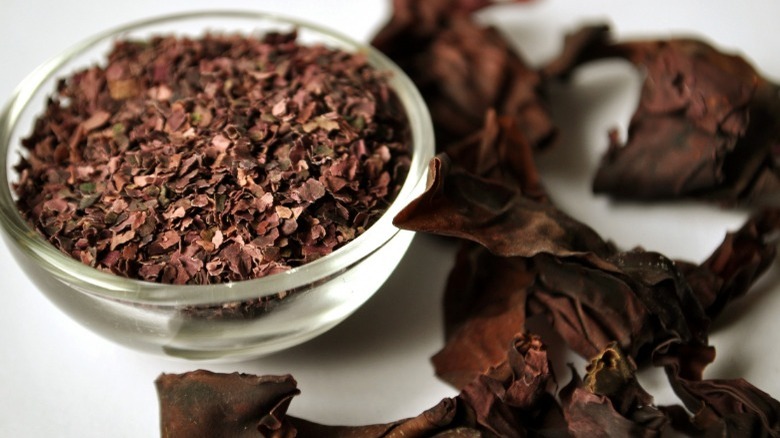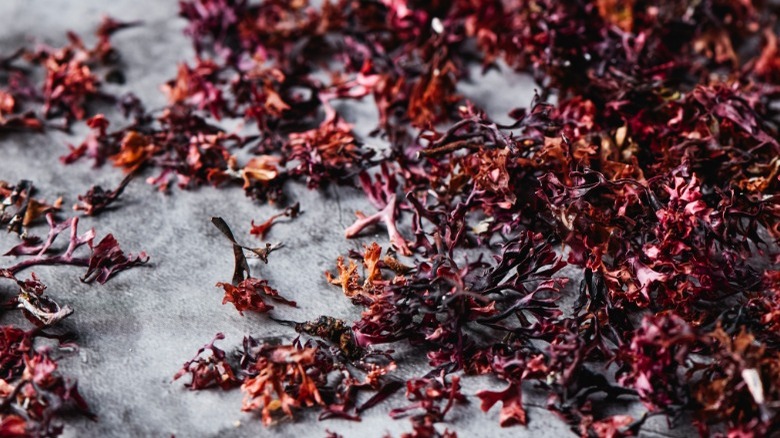 Also known as laver and "gim" in Korean, nori is probably the most well-known sea vegetable as it is readily available across the globe. The red algae grows in cold water in both the Northern and Southern Hemispheres and is then shredded, spread thin, dried, cut into sheets, and roasted (via Best Health).