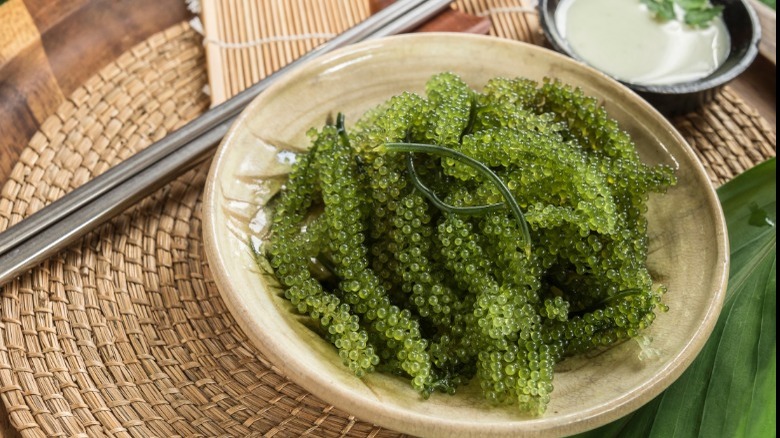 Umibudo is a type of green algae that grows in Japan, Vietnam, and the Philippines and is also known as sea grapes and green caviar because of its appearance as per Phys.org. It has a salty taste and bursts in your mouth like caviar does. As fresh umibudo has a short shelf life, it is commonly packed in seawater as dehydrated umibudo even in Japan. Once it soaks in fresh water for a few minutes, it can be enjoyed in exactly the same way as fresh ones according to Tsunagu Japan.
