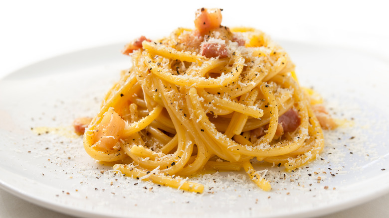 When it comes to Roman pasta, carbonara is in the big four. According to MasterClass, the creamy, egg-based pasta holds rank amongst amatriciana, gricia, and cacio e pepe. A classic Roman carbonara sauce is made by mixing pasta water, egg yolks, cheese, pepper, and guanciale (or pork cheek). If you are vegetarian or need to stay kosher, try swapping out guanciale for zucchini to enjoy it the way they do in Rome's Jewish quarter (via La Cucina Italiana). Or if you're a fan of ultra-savory breakfasts, consider making a breakfast carbonara in lieu of scrambled eggs.
