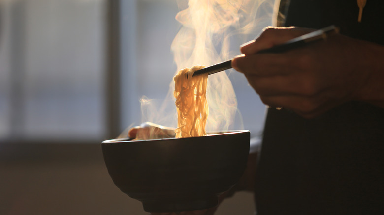 Ramen was first created by Chinese immigrants living in Japan and working in the country's soba shops, where they combined hearty wheat pasta popular in their homeland with savory Japanese broth. Durable noodles are an important component of ramen because they do not get soggy from absorbing too much broth, per Japanese Cooking 101. Ramen noodles come in a variety of shapes and textures — thin or thick, curly or straight — but this simple yet delicious meal became part of American culture only in the 1970s, a few decades after the Japanese first tasted it, per Myojo.