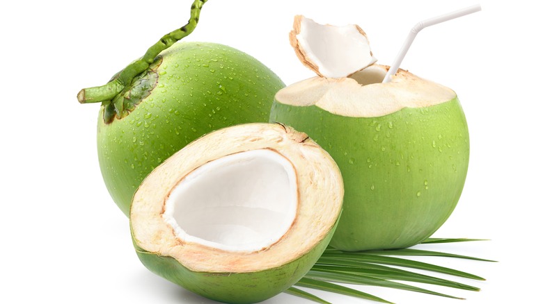 As a coconut ripens, more and more flesh forms from the liquid. For this reason, the fluid in young, green coconuts is most abundant and hydrating, per Healthline. The more mature — brown and hairy — coconuts that many people are more familiar with are beloved for their firm, white, and sweet flesh.