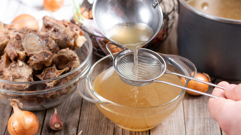 The first known recipe was discovered in Sir Hugh Plat's 16th century unpublished manuscripts (via Atlas Obscura). A recipe from Ann Shackleford's "The Modern Art of Cookery" stews calves feet, filet of veal, leg of mutton, and other parts of the animal over a gentle flame before straining the water. To the broth, Shackleford's adds egg whites and a hefty amount of salt, which turns the liquid into a rubbery glue. On the high seas, the slab would be added to a bit of boiling water to reliquefy it into a flavorful broth.