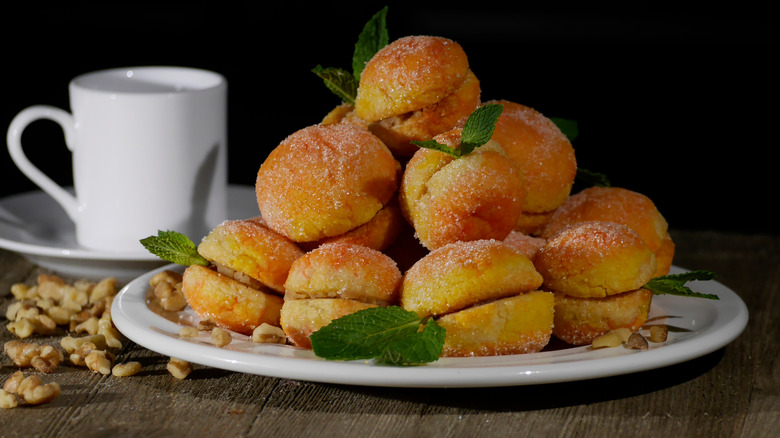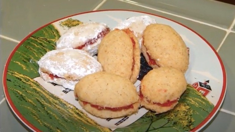 Possibly the most adorable sandwich cookies are the Croatian breskvices. Shaped and colored to resemble miniature peaches, they boast a filling of apricot jam, rum, and finely chopped walnuts. According to Tour Dalmatia, they are doused in peach brandy and rolled in sugar to finish off the gems. They're most often served at weddings and holidays since they're so labor intensive to make, but the end result, glittering with that dusting of granulated sugar crystals, is a stunner every time.
