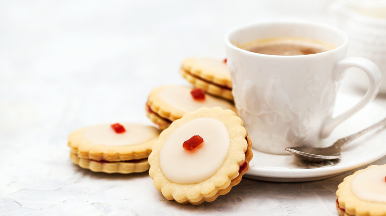 Linzer cookies are actually a scaled down version of a dessert called a linzertorte, which comes from Austria (per Eat2Explore). The original tart consists of an almond-meal crust, filled with cooked fruit, then topped with lattice work so the colorful filling shines through. These sandwich cookies embrace their origin by also having an almond base. A window of any design, also called an eye, is carved into the top cookie so that the jam will peek out, much like the original dessert's lattice work (per Food Reference). There are even savory linzer cookies if you're feeling adventurous!