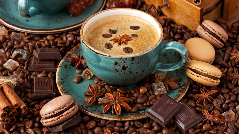 Waffles aren't just for breakfast, especially not in the Netherlands, the birthplace of the stroopwafel. Stroopwafels are thin pastries made on a special waffle iron, then sandwiched together with a layer of caramel. According to Dutch culinary history, stroopwafels were originally made with bakery scraps and sold cheaply, earning them the nickname "poor cakes" (per Gouda Original). Often eaten with coffee or tea, these sweet snacks are often placed like a lid on the steaming mug to warm up and soften the caramel filling.