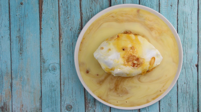 Floating Islands are tasty, but the dessert's real appeal comes from its impressive presentation. According to the BBC, the dessert consists of one or multiple "islands" made from stiffly-beaten meringue "floating" in crème anglaise vanilla custard. It's served chilled and often drizzled with caramel sauce. The cooking process is elaborate and multi-stepped — for fans of The Great British Baking Show, Floating Islands were the technical challenge in Season 2's "Desserts" episode, per PBS. But, the dessert only takes an hour to put together and doesn't require any special equipment beyond what can be found in a common home kitchen.