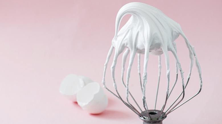 Now, it's time for the meringue. Grab those egg whites from earlier and hit 'em with some cream of tartar or caster sugar, per the BBC. Then, beat in sugar and vanilla until stiff peaks begin to form. Dollop a few heaping spoonfuls of the meringue into a hot saucepan full of milk and poach them over low heat until they're firm enough to hold their shape. Then, you can gently set your meringue islands on top of that custard sea, drizzle on the caramel sauce and/or garnish, and you've got a Floating Island worth of Julia Child herself.